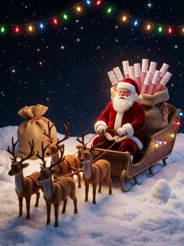 梦幻感与喜庆感交织,3D风与插画风融合,圣诞老人驾着鎏金雪橇飞越灯火璀璨的小镇,粒子光效洒落,营造温馨卡通氛围,尽显节日浪漫。