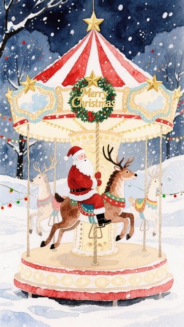 水彩风插画,圣诞老人骑着驯鹿在旋转木马上,梦幻温馨的冬夜场景,充满喜庆与可爱感,拟人化设计搭配印象画派色彩,传递节日欢乐。