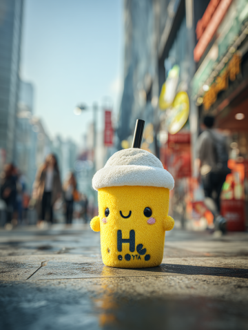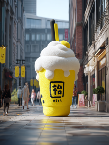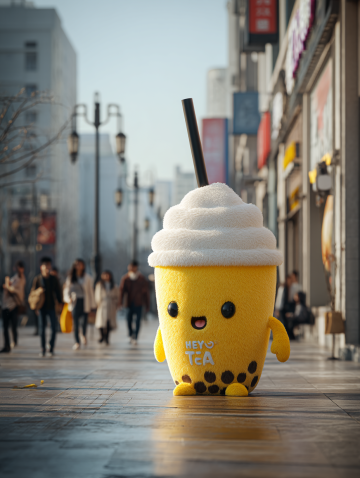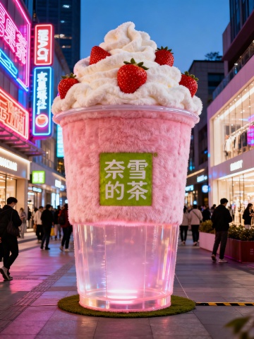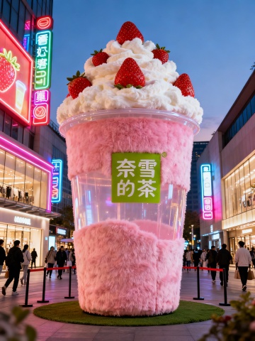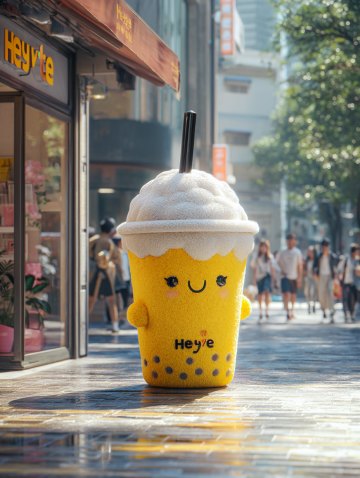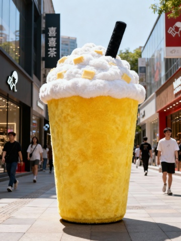 把图片主体做成充满创意和梦幻色彩的绘本风格的巨型毛毡艺术卡通风格雕塑放置在画面中心(主体的穿搭保持不变),主体站在一旁欣赏(与巨型主体形成比例反差),围栏隔离展示,背景是奶茶店门口