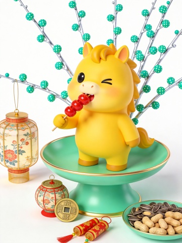 软3D风萌马手办,融合国潮与鎏金元素,喜庆红金配色,卡通可爱造型,手持金元宝,寓意“马上有财”,2026马年贺岁佳作。