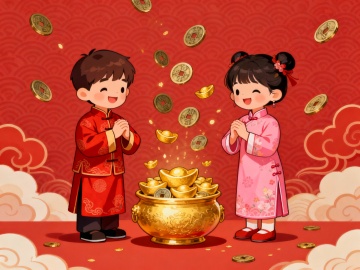 Q版卡通风格,一对穿着红色中式服装的童男童女,男孩梳着发髻,女孩扎着双丫髻,两人面带微笑,双手抱拳拱手作揖,中间摆放着一个金色聚宝盆,盆中有钱币不断撒向空中,形成金色的钱币雨,画面上方有遒劲有力的书法字体写着“恭喜发财”,文字边缘装饰着闪烁的金箔,整体色调喜庆红火,充满春节氛围,细节丰富,构图饱满