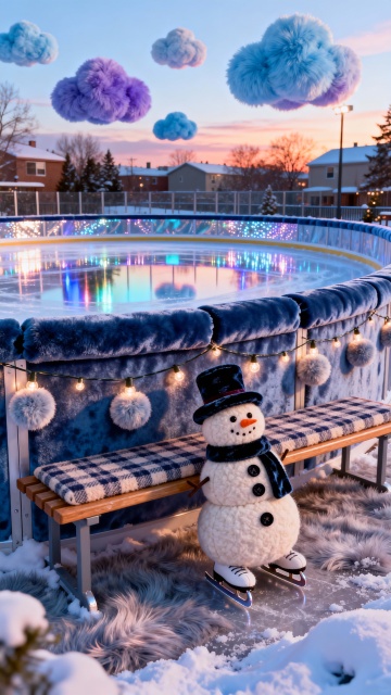 梦幻冬日场景,拟人雪人穿冰鞋滑行,毛绒云朵与暖灯点缀,3D卡通风结合虚拟现实质感,布艺围栏与毛发生长纹理营造温馨可爱氛围。