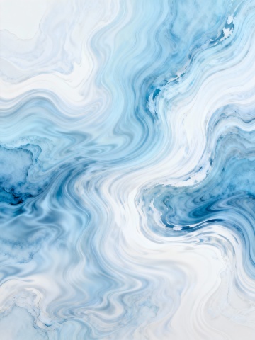 流体艺术风格背景,以柔和的天蓝色、粉彩色和白色为主色调,融合金色的金属光泽纹理,色彩过渡自然流畅,呈现出类似大理石纹和水墨晕染的流动效果,画面中包含多种不同走向的波浪状纹路和漩涡状图案,金色元素以细长线条、斑点和不规则块状分布其中,整体光影柔和,高光区域呈现出细腻的珠光质感,营造出梦幻、优雅且富有动感的视觉氛围,具有高度的设计感和装饰性。