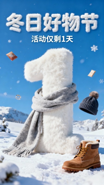 一个倒计时海报,一个大大的冰雕数字“1”,立体,顶部创意手写标题内容“冬日狂欢季”,小字内容“距离活动开始还有1天”,冬季雪山森林背景,云朵,树木,在滑雪、打雪仗的人,空间立体感,粘土