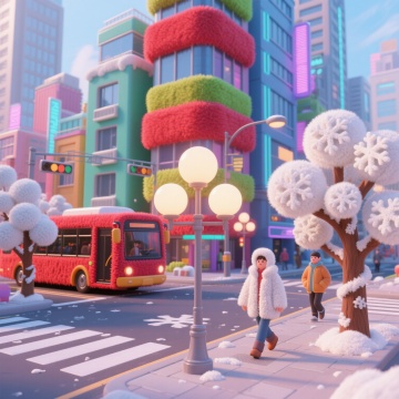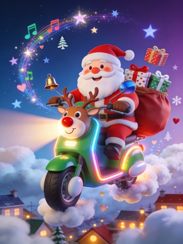 软3D风格圣诞场景,卡通感十足的圣诞老人驾着雪橇飞越霓虹闪烁的未来都市,融合梦幻粒子与虚拟现实元素,营造喜庆而奇幻的节日氛围。