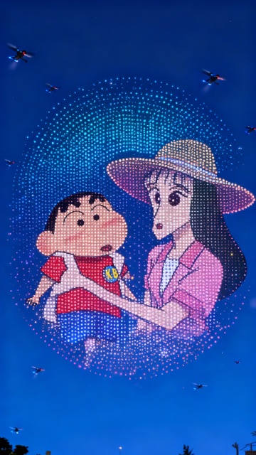 梦幻粒子构成的动漫风画面,蜡笔小新与妈妈在夜空闪耀,无人机环绕,温馨可爱,充满虚拟现实趣味感。