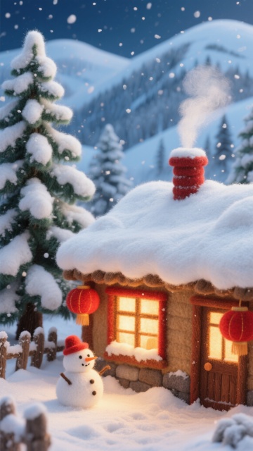 软3D风雪夜小屋,温暖灯光映衬红灯笼,雪人相伴,卡通感十足,营造温馨梦幻的冬日童话氛围。