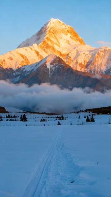 写实主义摄影风格的雪山全景,湛蓝纯净的天空中点缀着几缕形态各异的絮状白云,画面中央矗立着巍峨的雪峰,山顶覆盖着厚实的积雪,山脊线锐利清晰,阳光照射下的雪面呈现出明亮的高光与柔和的阴影过渡,山体下部为深褐色岩石,岩石纹理粗糙且层次分明,近处的山峦呈现出暖棕色与深褐色的渐变,山谷间可见部分冰川痕迹,整体光影为清晨或傍晚的侧逆光效果,营造出壮阔、宁静而神圣的氛围,增加几处山间飘动的薄雾,使画面增添一丝朦胧的神秘感。
