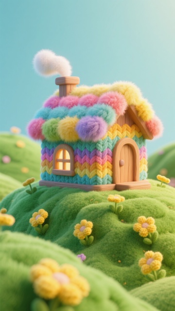超现实主义风格的毛茸茸城市全景,城市中的所有建筑、街道、树木、车辆、路灯等元素均由不同颜色的毛线编织而成,远处的高楼大厦像巨型毛线团堆叠,街道如同彩色毛线铺就的路径,树木是蓬松的毛线球组成的树冠,车辆是毛线缝制的造型,天空呈现柔和的淡蓝色调,整体画面细节丰富,充满柔软可爱的质感,营造出温暖治愈的氛围