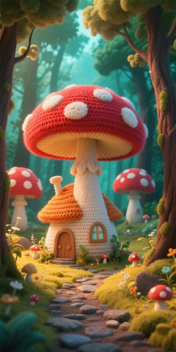 梦幻感十足的软3D风格童话森林,毛发生长风与刺绣质感融合,可爱卡通小屋藏于红白斑点蘑菇之间,温馨趣味盎然。