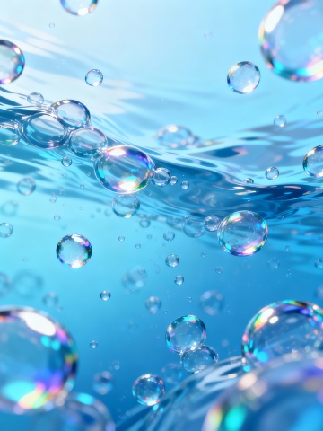 超写实摄影风格,流动的蓝色和紫色渐变液体表面,充满梦幻般的光泽与虹彩效果,光线从上方照射形成明亮的高光和细腻的波纹阴影,透明质感中点缀着大小不一的气泡,整体呈现出宁静而神秘的氛围,色彩和谐且富有层次感,画面细节丰富,纹理清晰,具有强烈的视觉冲击力和沉浸感。