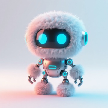 软3D风格的未来感机器人,融合金属风与毛发生长设计,霓虹灯蓝光点缀,拟人化卡通造型,科技与可爱并存,节日氛围浓厚。