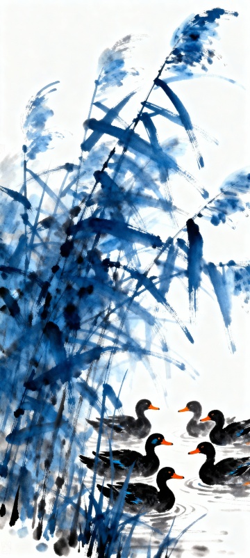 水墨写意风格,蓝调芦苇与鸭群共舞,国潮插画演绎静谧清新之境。