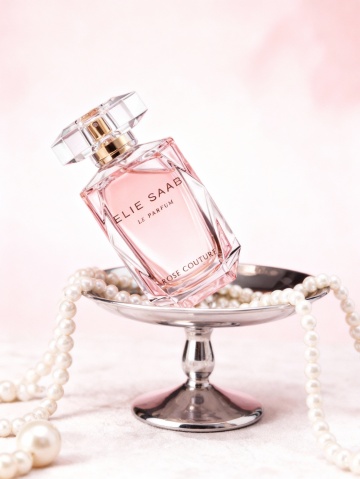 唯美感与浪漫感交织的3D重拟物风香水场景,玻璃瓶身透出柔和光影,玫瑰花瓣环绕,营造清新优雅的实景氛围。