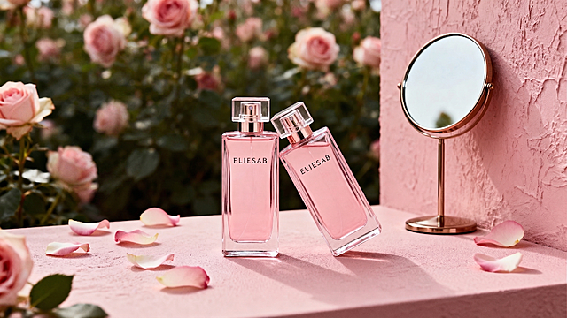 唯美感与浪漫感交织的3D重拟物风香水场景,玻璃瓶身透出柔和光影,玫瑰花瓣环绕,营造清新优雅的实景氛围。详情