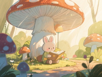 在茂密森林深处,一座由蘑菇与藤蔓搭建的童话书屋,书本从窗户飘出化作会飞的书页精灵,小鹿趴在屋前翻看绘本,阳光透过树叶洒下光斑,水彩插画风格,色彩清新柔和,突出奇幻治愈氛围