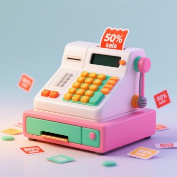 软3D风格的卡通收银机,色彩柔和,充满可爱感与促销氛围,搭配飞舞的折扣标签,营造出轻松愉悦的购物节视觉体验。