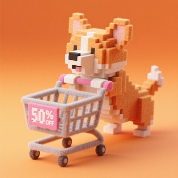 3D毛绒质感购物车拟人化设计,萌趣大眼表情搭配彩妆满载,红金配色呼应节日氛围,卡通风格与面料纹理交织,传递可爱趣味的购物狂欢感。