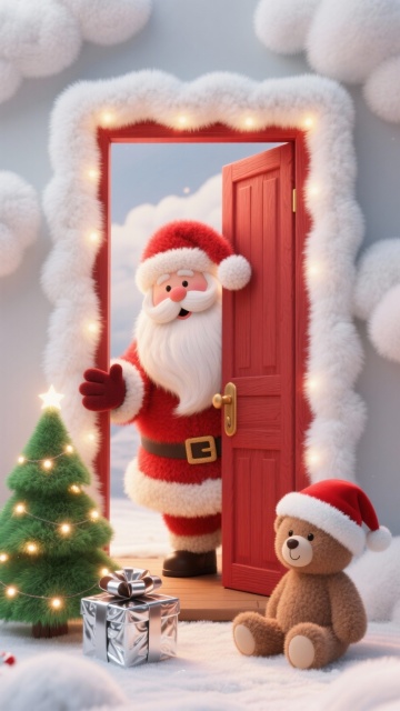 软3D风圣诞场景,卡通感十足的圣诞老人与驯鹿雪橇,搭配梦幻灯光与粘土质感圣诞树,营造喜庆温馨的节日氛围。