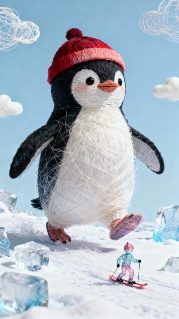 软3D风格雪人,毛线缠绕呈现面料质感,拟人化表情可爱生动,手持雪花营造梦幻温馨氛围,蓝色渐变背景点缀飘雪,节日趣味感十足。