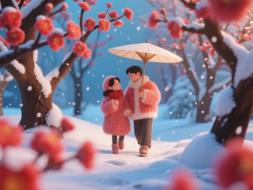 冬日雪景中的梅花林,红梅绽放枝头,一对情侣撑着油纸伞漫步其中,雪花轻轻飘落,整体画面呈现出柔软的毛绒质感,温暖而浪漫