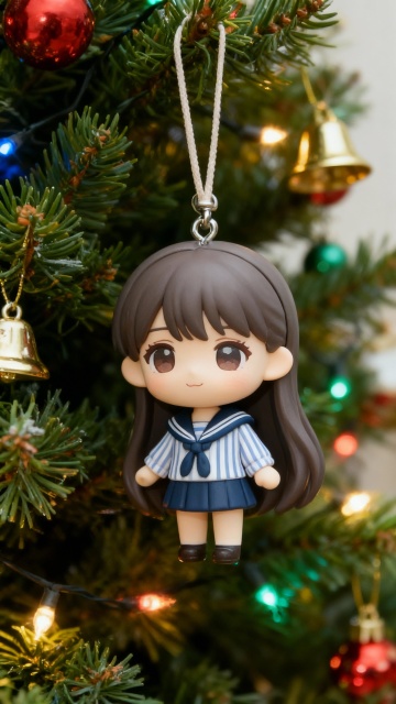 软3D风动漫女孩挂饰,卡通感十足,身穿水手服,悬挂于圣诞树上,搭配彩灯与铃铛,营造温馨喜庆的节日氛围。