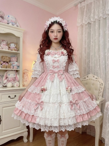 一个亚洲模特穿着图片上的Lolita裙子,微微侧身的姿势,身上穿着Lolita的配饰,妆容和发型都是相搭配的,背景是浅色系可爱风格的室内,可爱和谐的氛围