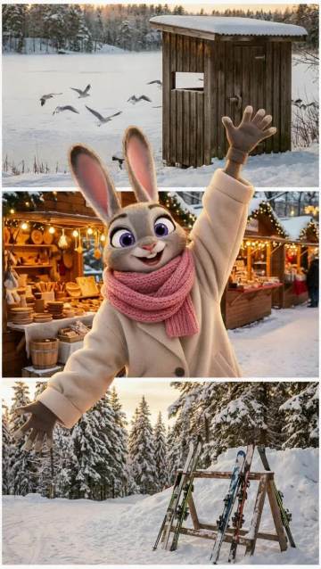 卡通感与软3D风融合,拟人化兔子在冬日小镇中欢快挥手,光影柔和,营造温馨梦幻的节日氛围。
