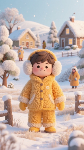 卡通男生穿姜黄居家保暖服,戴毛绒耳一副冬日的乡村田野,房子是毛绒绒的,树木也是毛绒绒的,人们穿的衣服都是毛绒绒的,一副冬日的毛绒图