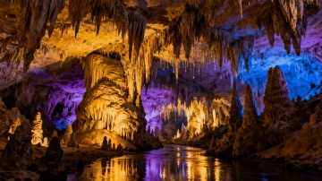 微型探险家行走在巨大的冰洞里,洞内布满发光的水晶饰品,巨大的结霜钟乳石,节日灯光闪烁的光束