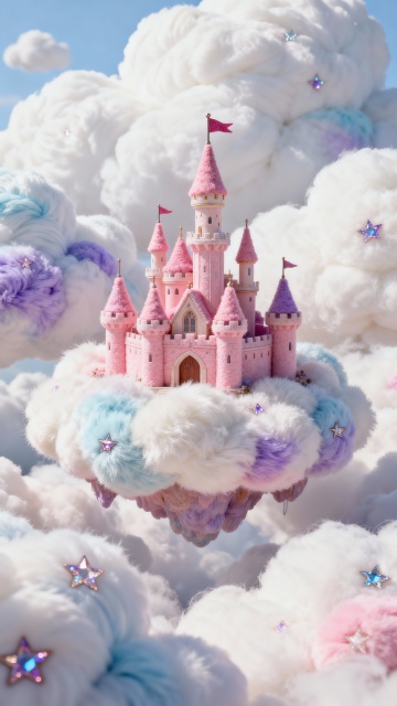梦幻粉色城堡漂浮于毛绒云海,融合软3D与粘土风,点缀闪亮星星,营造甜蜜可爱、超现实童话氛围。