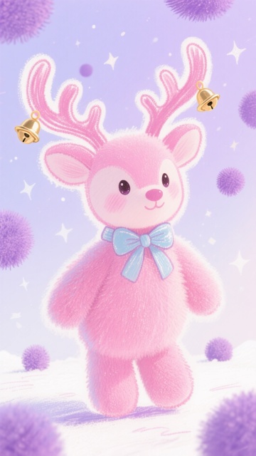梦幻插画风,粉嫩小鹿拟人化设计,毛茸茸质感搭配铃铛与紫绒球,营造冬日童话氛围,柔和色系传递可爱与温暖。