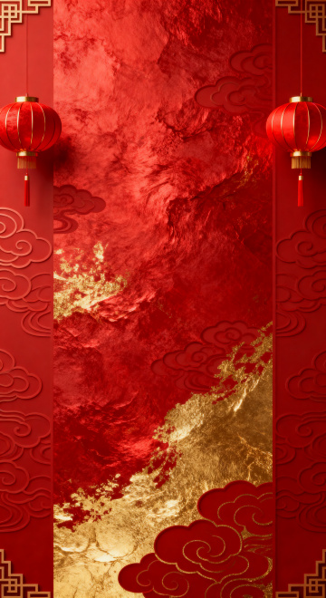 国潮风3D场景,红金配色尽显喜庆感,重拟物设计融合灯笼、祥云与扇形元素,鎏金细节与粒子光效点缀,营造浓厚中式节日氛围。