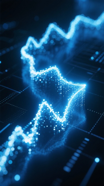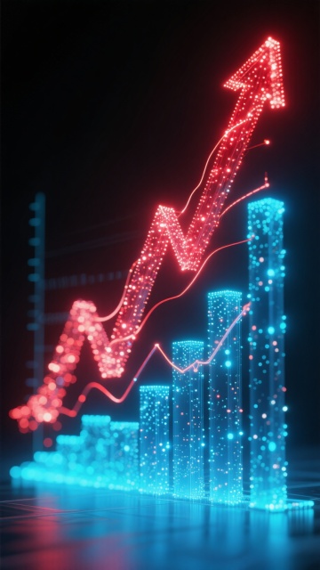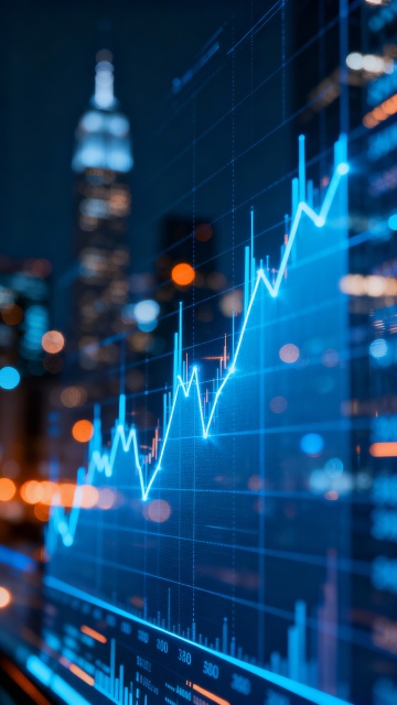 赛博朋克风格的数据可视化海报,以深邃的深蓝色和明亮的青色为主色调,光线从下方和侧面柔和照射,形成渐变光影效果和轻微的高光反射,整体呈现出科技感与未来感并存的神秘氛围。画面下方是由发光线条构成的网格地面,上面分布着向上延伸的蓝色柱状图表和折线图,数据线条清晰锐利且具有透明质感。背景是虚化的城市剪影,高楼轮廓在蓝青色光晕中若隐若现,点缀着红色和黄色的光斑作为点缀。构图采用近实远虚的景深控制,前景数据图表清晰突出,背景城市光影朦胧,营造出强烈的空间层次感和视觉引导线,整体设计简洁而富有冲击力,能高效传达科技与数据的核心主题。