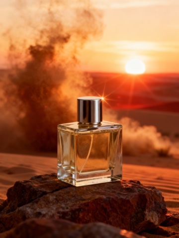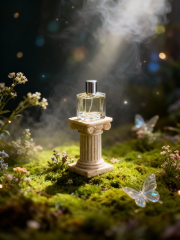 产品摄影,放置在堆叠的深色石头上,周围是茂密的绿色植物和白色小花。树叶间透过的斑驳阳光(柔和的金色光束,轻微镜头光晕),在瓶身和石头上形成斑驳的阴影;背景中淡淡的雾气增强层次感。超写实,8K,背景植物柔焦,瓶身细节锐利。