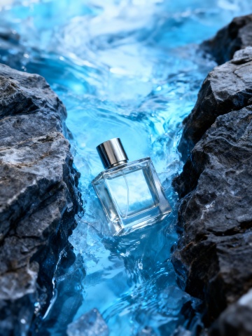 玻璃风瓶身置于清冽溪流,液态光影交织,静谧自然中透出清爽与清透感,虚拟与实景交融,如夏日沁凉之息。