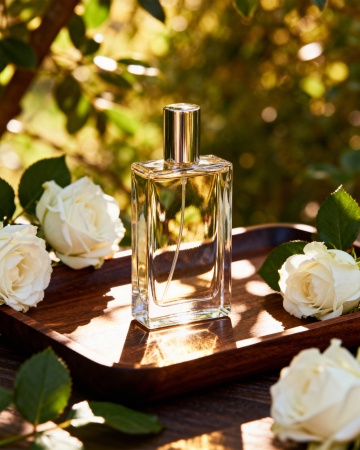 光影交织,玻璃瓶身映衬金色瓶盖,白玫瑰环绕木盘,柔和自然光营造浪漫优雅氛围,金属与玻璃质感交融,唯美感十足。