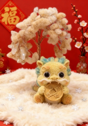 这个作品灵感是 “毛绒裹住的中式福气”:以貔恘为核心,把祥瑞貔恘做成圆滚滚羊毛毡萌物,叼着毛绒铜钱;将招财树换成软乎乎毛绒枝叶 + 水晶挂坠,搭配红墙福字的新年场景。既保留 “招财纳吉” 的传统寓意,又用毛绒的柔软消解严肃,让福气变成能触摸的治愈萌物,适配 “万物毛绒” 的温柔改造主题。
