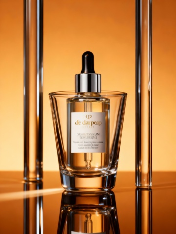 采用暖调纯色渐变背景,主体位于画面中心,占30%,背景搭配同色系的纯色拱门装饰结构,形成规整的几何布局,台面散落几颗同色系的液态质玻璃球,强化色调一致性的同时,整体为暖调精致的高端护肤展示风格,统一的红橙色调突出产品的温润质感,几何拱形结构提升了画面的简约高级感