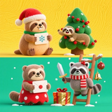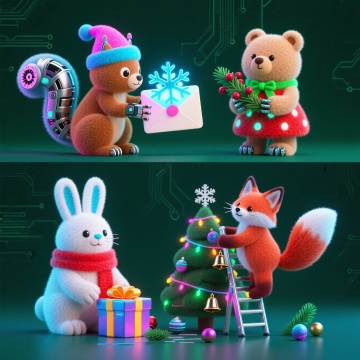 4个圣诞元素,上下两行对齐排列。分别是1.戴红围巾的企鹅,双手举着堆叠的金蝴蝶结圣诞礼盒,迈步向前。2.驯鹿,奋力拉着装满红绿礼盒、插着拐杖糖的雪橇。3.圣诞老人,踮脚将金色星星挂在圣诞树顶。4.精灵女孩,穿红雪花裙,在饰有白毛绒边、雪花刺绣的巨型圣诞袜旁整理礼物盒。深绿色背景。