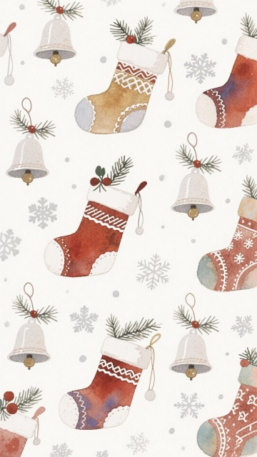 水彩风插画,融合轻拟物与印象画派手法,圣诞袜与铃铛点缀雪景,传递喜庆温馨的节日氛围。