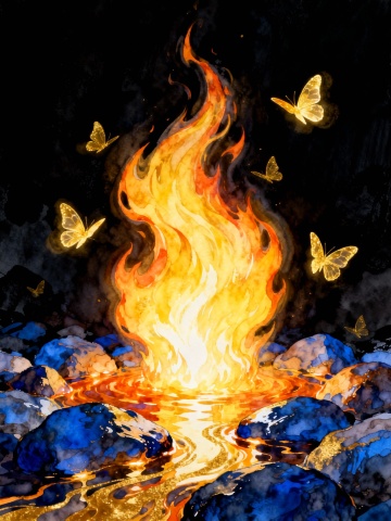 以深邃黑色为背景,右下角有明亮的橙红色火焰向上燃烧,火焰边缘呈现出渐变的橙黄色,周围散布着大量橙红色的火花和光斑,部分光斑带有模糊的圆形光晕效果,整体营造出热烈、动感且具有强烈视觉冲击力的氛围,融入火山熔岩元素,展现熔岩流动般的炽热质感与动态火花四溅的景象。