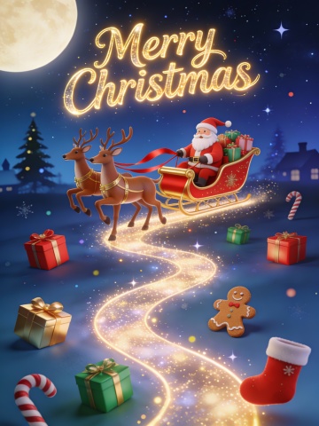 梦幻3D风格圣诞场景,软3D质感结合鎏金粒子光效,营造温馨喜庆氛围,卡通感十足的圣诞老人驾鹿飞驰,满载礼物,节日元素灵动环绕。