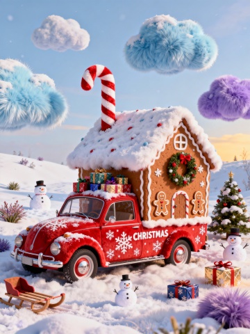 3D微缩艺术风圣诞场景,粘土质感姜饼屋与毛绒红卡车,搭配梦幻雪景与卡通元素,营造喜庆温馨的节日氛围。