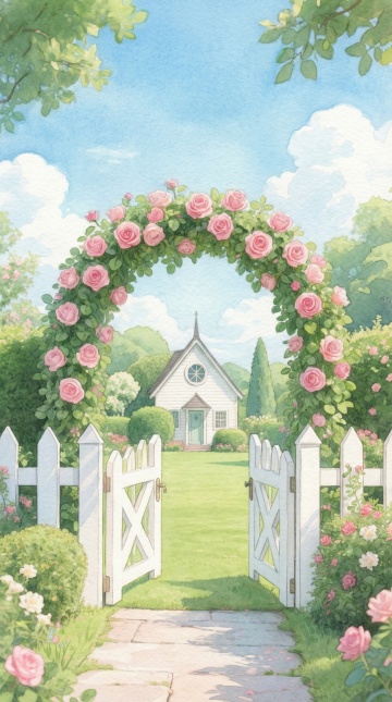 梦幻水彩插画风,喷泉流淌星光粒子,花丛环绕,飞鸟掠过粉紫晚霞,营造浪漫温馨的虚拟自然场景。