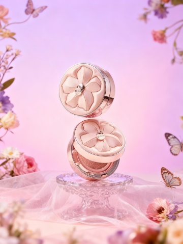 3D微缩艺术风,金属质感粉饼盒置于粉色礼盒中,搭配毛绒圣诞树与雪花,营造甜蜜温馨的节日氛围。