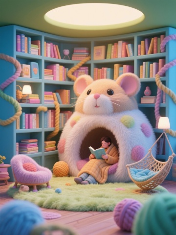 软3D风卡通场景,拟人化大老鼠屋中女孩温馨阅读,毛发生长质感与粘土风格结合,梦幻可爱,趣味十足。