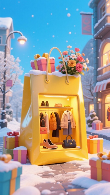 梦幻感与温馨感交织的冬日街景,巨型黄色购物袋化作微缩时尚橱窗,融合3D风与软3D质感,呈现潮流穿搭与节日礼物的甜蜜碰撞。