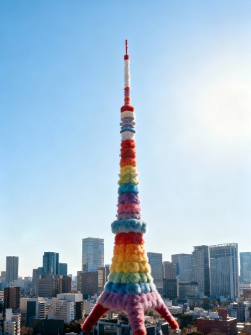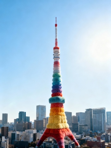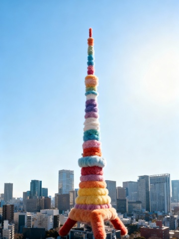软3D风东京塔,毛发生长般彩虹绒毛覆盖,梦幻可爱,超现实主义与卡通感交织,节日氛围跃然眼前。
