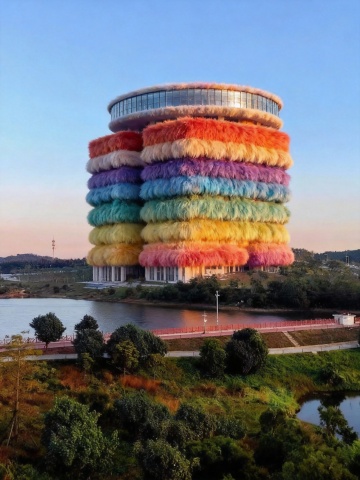 建筑整体呈现出全毛绒质感的风格,毛绒有层次感,毛绒颜色为彩虹色调。建筑保留原始形状,水平矫正